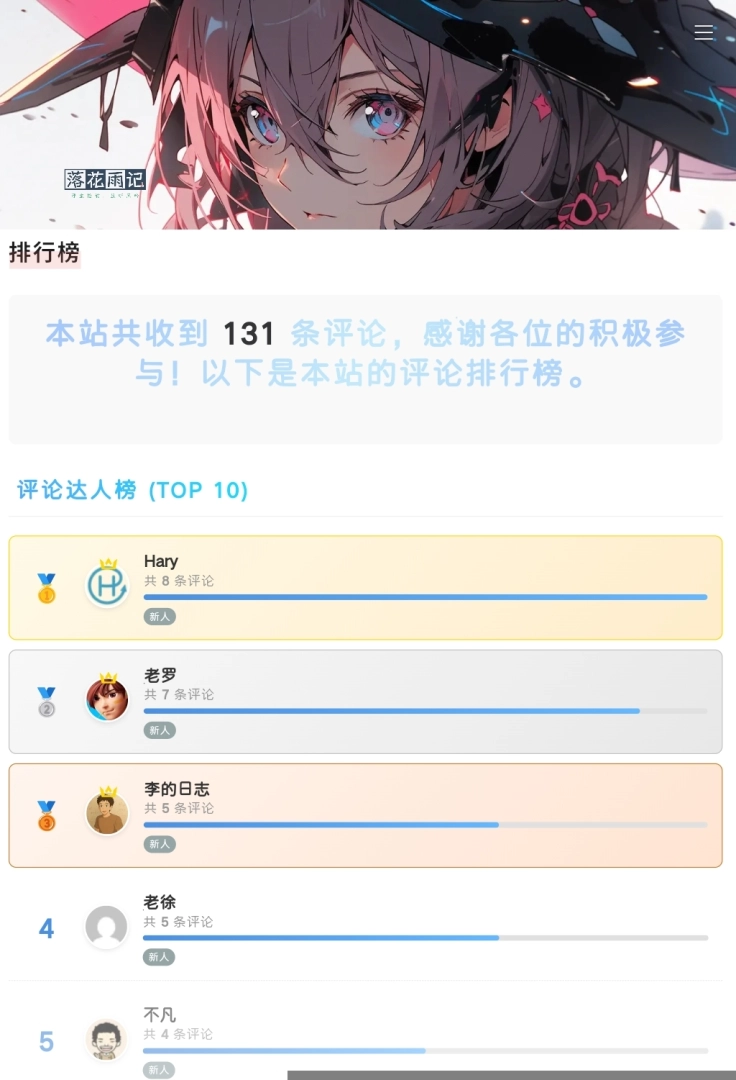 3. 添加了评论排行榜页面 看了各位大佬的博客好像都有,必须搞一个,紧跟潮流,刚好放在评论框右下方,不过好像有点不是很美观༎ຶ‿༎ຶ