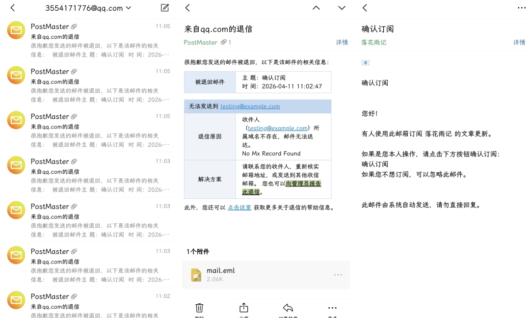 中午收到一封QQ邮箱的退信推送,也没管,不一会就连续收到退信,点进去看了一下好像内容是文章订阅,应该是文章底部的订阅被人一直刷了,起初也没在意,但是QQ邮箱一直给我推送就很烦,干脆就给直接禁用了。